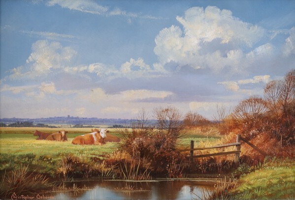 Lot 773 Christopher Osborne (British, b.1947), "March Sunlight", oil on board, signed recto, titled and dated 2011 verso, 19cm x 29cm, within a gilt and hessian frame. £50-80