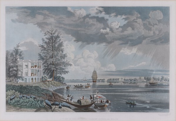 Robert Havell, after James Baillie Fraser (1783-1856) "A View of the Botanic Garden House and Reach" (Kolkata, India), engraving with aquatint and hand-colouring, published for "Views of Calcutta and its environs, from drawings Executed by James B. Fraser, Esq. From Sketches made on the Spot" by Rodwell and Martin 1824-1826, 32cm x 46cm, within a stained wood frame.