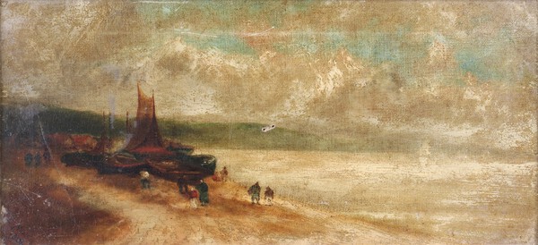 Lot 781 Lily Vile, Coastal Landscape with Fishing Boats and Figures, oil on canvas, signed and dated 1901, 21cm x 47cm, within a gilt frame. £40-50