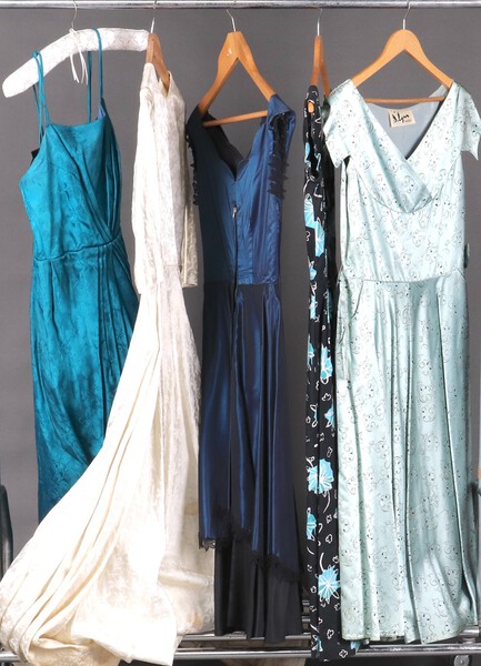 A lady's 1950's D Lynn turquoise sleeveless day dress, a Linzi Line blue floral day dress, an unmarked blue sleeveless evening dress, a black evening dress labelled "This For you by B Lanes", an unmarked full length wedding dress and a blue evening dress (5)