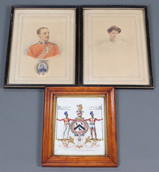 Of East India Company interest, a watercolour of the Armorial bearing of Major General Sir Henry Worsley GBE 1768-1841 23cm x 18cm, together with H J Walker, a pair of watercolour portraits of Sir Henry Worsley as a Lieutenant and Lady Worsley 29cm x 18cm, an early black and white portrait miniature of a young Sir Henry Worsley in a silver frame