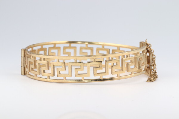 Lot 8 A yellow gold, testing as 14ct, pierced gold bracelet with Grecian key decoration, 14.5 grams £540-640