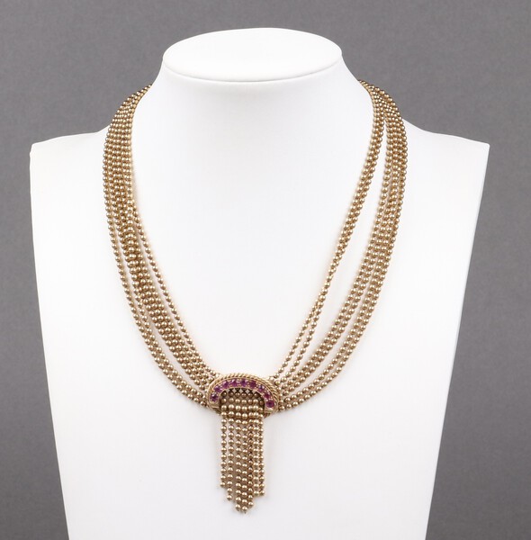 Lot 80 A gold marked 750, 6 strand bead link choker/necklace set 9 pink gems, 38cm, 77.2 grams £5000-7000