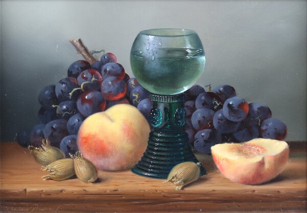 Lot 801 **Brian Davies (British, 1942-2014), Still Life with Goblet, Grapes and Peaches, oil on board, signed, 17cm x 24cm, within a gilt composition frame. **Please note Artists Resale Rights may be payable on this lot £150-250