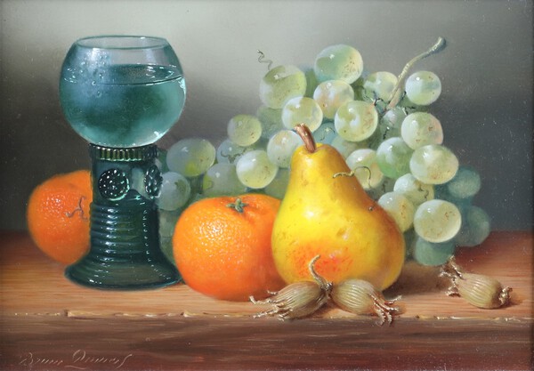 Lot 802 **Brian Davies (British, 1942-2014), Still Life with Goblet, Grapes, Pear and Oranges, oil on board, signed, 17cm x 24cm, within a gilt composition frame. **Please note Artists Resale Rights may be payable upon this lot £150-250