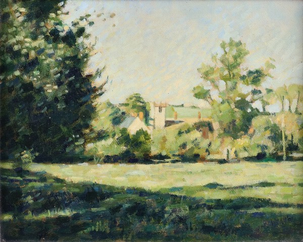 Lot 803 **Michael Bowman (British, b.1943), "Deepening shadows, Stratton", oil on canvas, signed and dated "85 recto, titled label verso, 19cm x 24cm, within a gilt frame.**Please note Artists Resale Rights may be payable upon this lot £50-75
