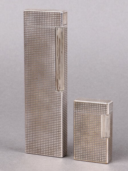 Lot 805 A Dupont silver plated table lighter, the base marked 017140 14cm h x 3cm w x 1cm d and 1 other monogrammed JJC 55cm £80-100