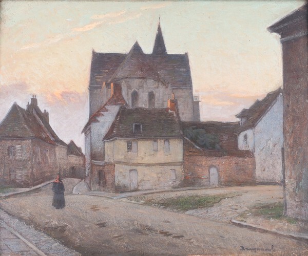 Louis Braquaval (French, 1854-1919), Village Scene with Church, Houses and a Figure on a Road, late 19th/early 20th century oil on panel, signed, 36cm x 44cm, within a gilt composition frame with foliate strapwork and corner crestings.