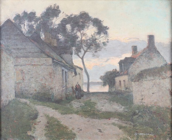 Lot 808 Louis Braquaval (French, 1854-1919), Coastal Village with Figures near a Cottage, late 19th/early 20th century oil on panel, signed, 36cm x 44cm, within a composition frame with foliate strapwork and corner crestings. £300-500