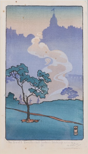 Lot 816 Ellen Mary Watanabe (British, 1887-1940), "The Giants Breath - East Gardens, Edinburgh Series No 4", woodcut on paper, signed and editioned 11/100 in pencil, 30cm x 17cm, within a painted wood frame £100-200