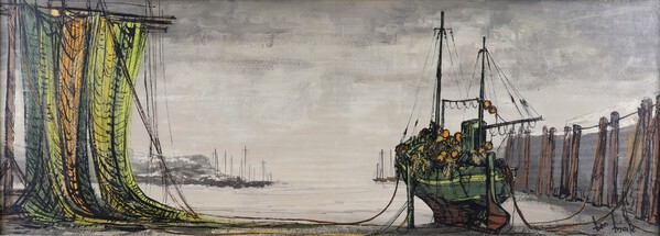 Lot 819 **Ben Maile (British, 1922-2017), Fishing Boats and Nets in a Harbour Setting, 20th century oil on board, signed, 29cm x 83cm, within a painted wood and hessian frame. **Please note Artists Resale Rights may be payable on this lot £60-90