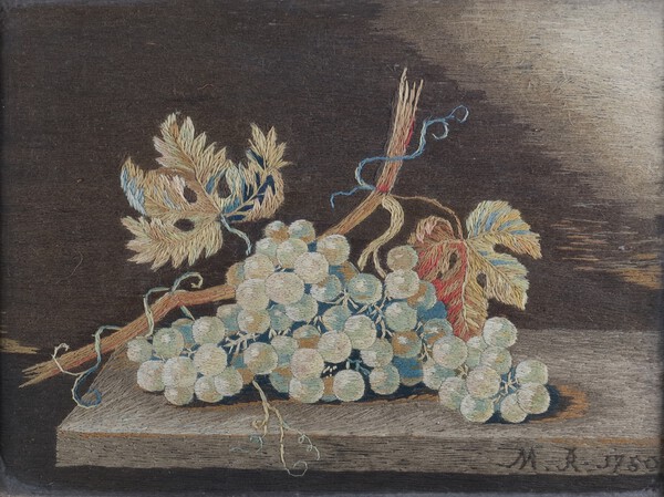 Lot 822 18th Century British or Dutch School, Still Life with Grapes, silkwork and woolwork embroidery, signed with initials ‘M.R.’ and dated 1750, 31cm x 42cm, within a gilt composition frame. £60-90