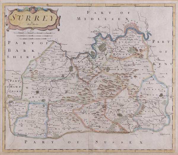 Lot 826 Robert Morden (c.1650-1703) "Surrey", engraving with hand-colouring, 39cm x 52cm, within a gilt frame. £40-60