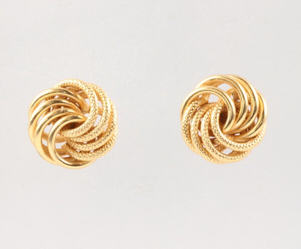 Lot 83 A pair of gold marked 750 knot ear studs 1.5g together with a pair of gold marked 9ct screw clip ear mounts 0.6g £90-120