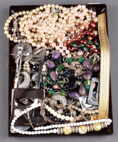 Lot 85 A gilt bracelet and a quantity of vintage beads, simulated pearls and costume jewellery £40-50