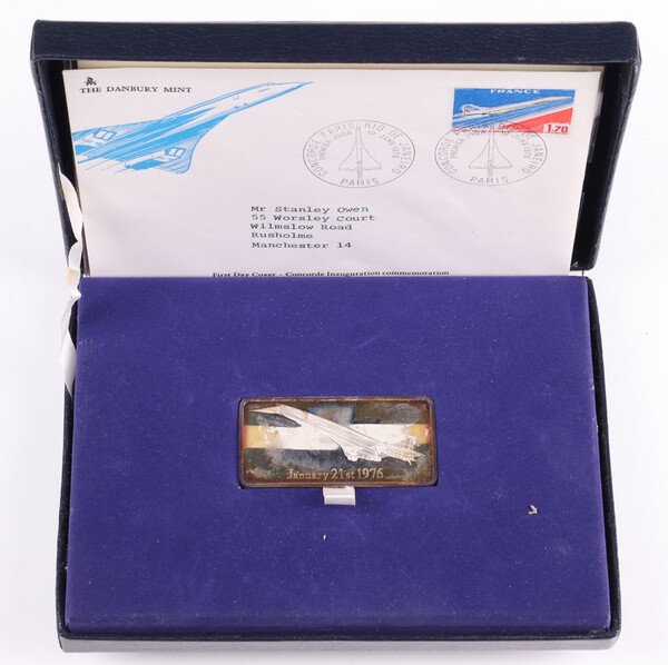 A silver ingot commemorating the launch of Concorde on January 21st 1976, 47.8 grams, the silver ingot depicting a flying Concorde, in a fitted presentation case, with certificate of authenticity and a first day cover addressed to the recipient