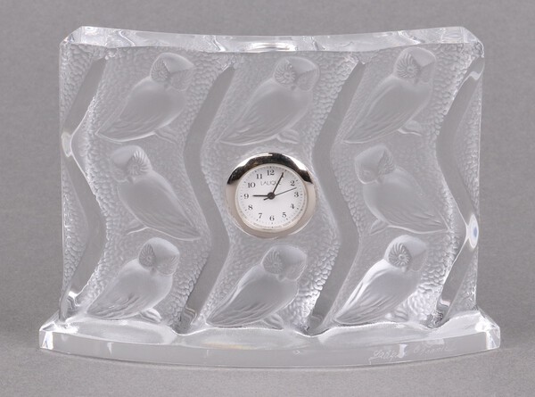 Lalique, a "Clock Hulotte" crystal table timepiece, the curved glass case moulded with owls, etched 'Lalique France' to bottom right hand front corner 9cm h x 12cm w