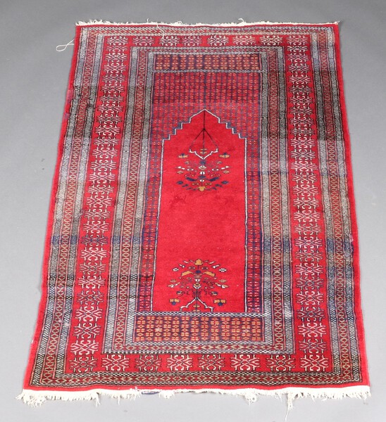 Lot 852 A red and blue ground Belouche rug with mihrab and mosque lamp to the centre within a multi row border 157cm x 94cm £30-40