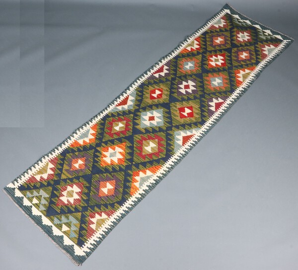 Lot 853 A black, white and red ground Maimana Kilim runner with all over diamond design 284cm x 78cm £80-120