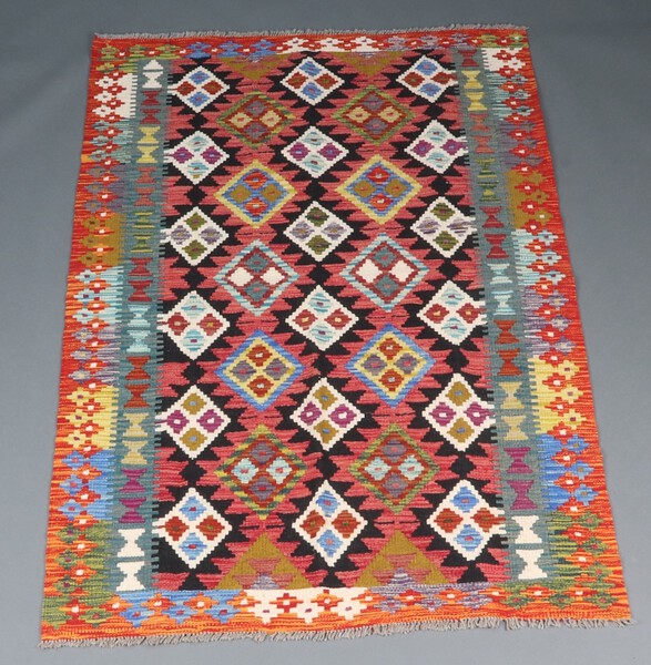 Lot 854 A black, red and orange ground Maimana Kilim rug with overall geometric design 193cm x 128cm £80-100