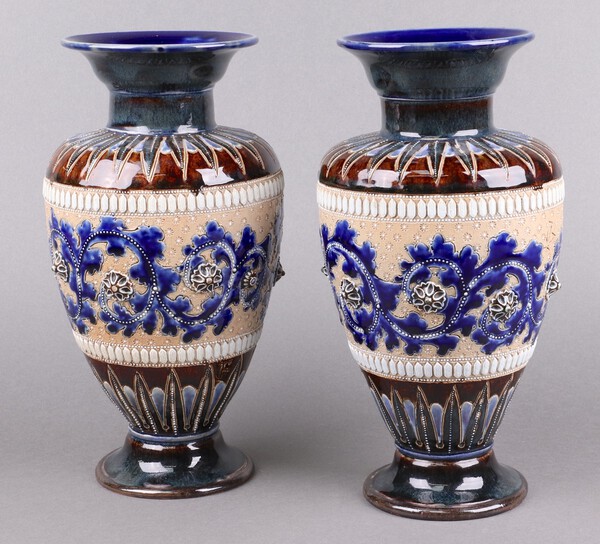 A pair of George Tinworth Doulton Lambeth salt glazed vases with roundel decoration, the bodies incised TG, the base impressed Doulton Lambeth 1877 and incised ELH (Eliza L Hubbert) 29cm  £80-100