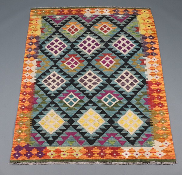 Lot 859 A green, black and orange ground Maimana Kilim rug with all over diamond design 185cm x 125cm £80-120