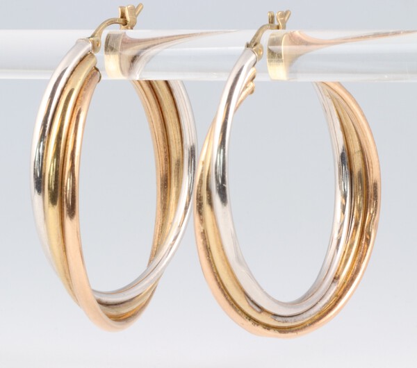 A pair of 3 colour gold marked 375 hoop earrings, 3.6g