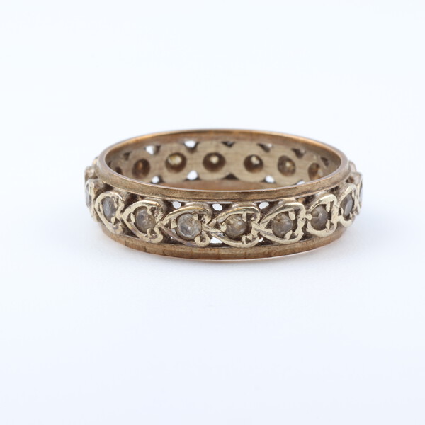 A yellow gold testing as 9ct eternity ring set white stones, size N, 3 grams
