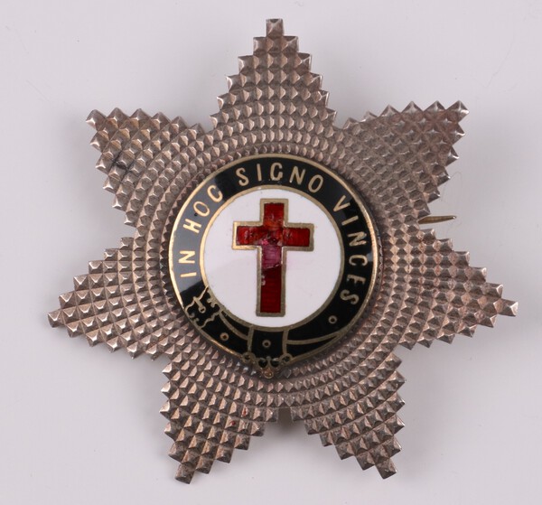 Lot 90 Masonic, an Edwardian silver gilt and enamelled Knights Templar Knights breast star London 196, by George Kenning & Sons, 6cm, 32.3 grams £60-80