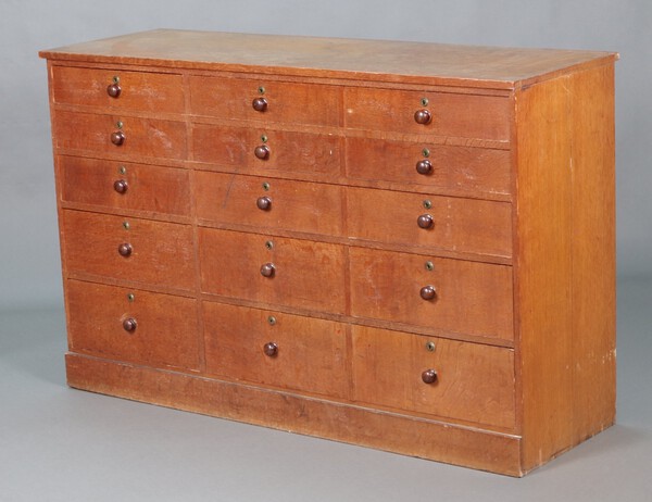 Lot 901 A Victorian rectangular oak chest of 5 short drawers flanked by 5 long drawers with turned handles, raised on a platform base 94cm h x148cm w x 49cm d £200-300