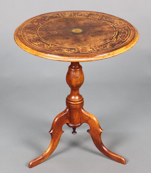 Lot 906 A Victorian circular inlaid figured walnut occasional table, raised on pillar and tripod base 60cm h x 54cm diam. £50-75