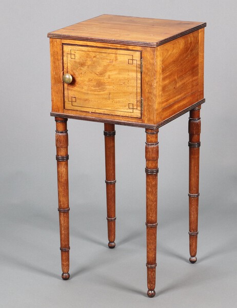Lot 907 A Georgian mahogany pot cupboard enclosed by a panelled door, raised on turned supports 80cm h x 37cm w x 37cm d £40-50