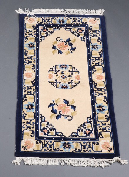 A 1930's white and blue ground Chinese floral patterned rug 122cm x 65cm