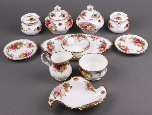 A collection of Royal Albert Old Country Rose pattern table china including pair of lidded sugar bowls (1 with chips to rim and a 2nd), pair of squat circular lidded urns, twin handled oval tray (second), sugar bowl and cream jug (seconds), 2 circular dishes (seconds), shaped dish (second) and a ring stand