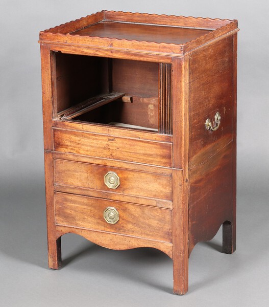 Lot 912 A Georgian mahogany tray top commode with brass drop handles and tambour shutter above 2 drawers 89cm h x 56cm w x 47cm d £40-60
