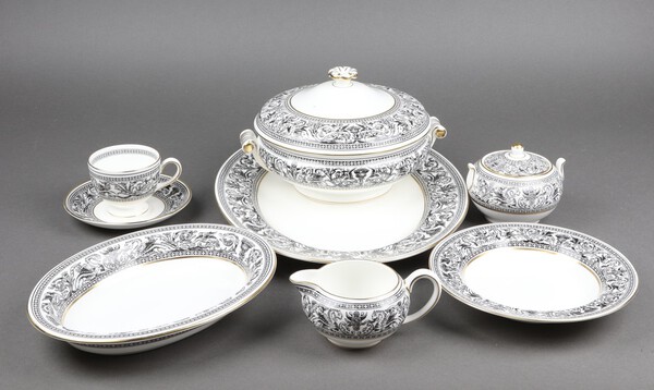 Lot 926 A 78 piece Wedgwood Florentine pattern dinner service comprising twin handled soup tureen, oval meat plate, 3 oval dishes, 14 dinner plates, 12 soup bowls, sauce boat and stand (chip to stand), 12 side plates, bread plate, 12 tea plates, coffee pot, teapot, lidded sugar bowl and cream jug, 8 cups, 9 saucers (1 rings flat) £100-150