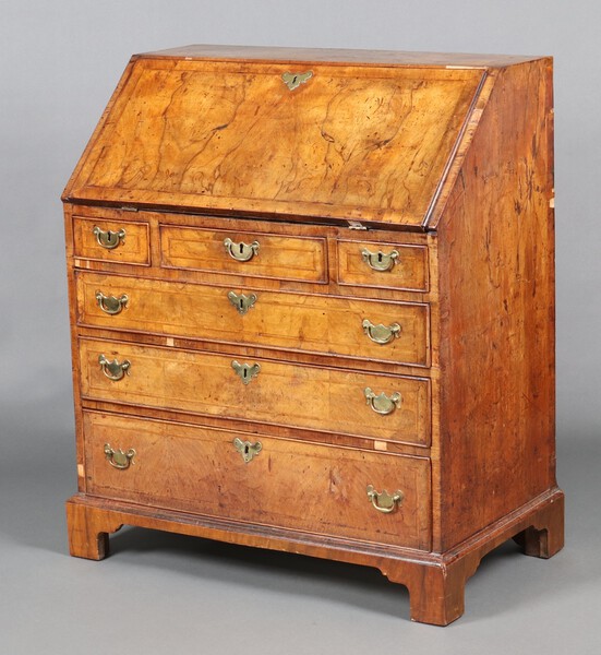 A Queen Anne walnut and crossbanded bureau, the fall front revealing a well fitted stepped interior with cupboard, pigeon holes, secret drawer and drawers above 3 short and 3 long drawers, raised on bracket feet 104cm h x 88cm w x 50cm d