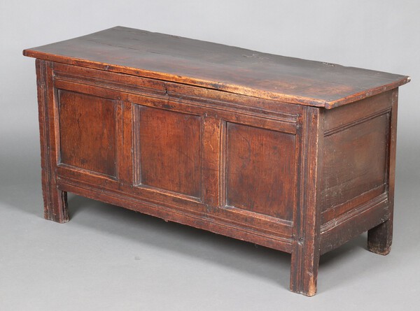 Lot 926 A 17th Century oak coffer of panelled construction with hinged lid and original hinges, 64cm h x 132cm w x 53cm d £90-120