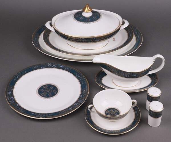 A 47 piece Royal Doulton Carlyle pattern dinner service comprising large oval meat plate (second), small oval meat plate, twin handled tureen and cover, sauce boat and stand, salt and pepper, 8 dinner plates, 8 tea plates, 8 twin handled soup bowls and saucers  £50-75