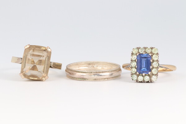 Lot 93 A gold marked 9ct paste set ring size N, 2.7g, a white metal wedding band size Q and a yellow metal and citrine set dress ring size J £60-80