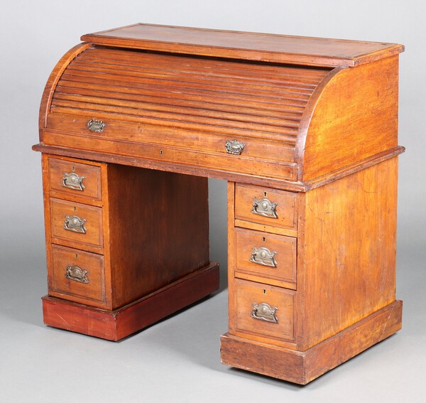 Lot 933 A Victorian walnut cylinder bureau, the interior fitted pigeon holes and 4 short drawers, the base fitted 6 short drawers with embossed metal drop handles 97cm h x 106cm w x 59cm d £50-75
