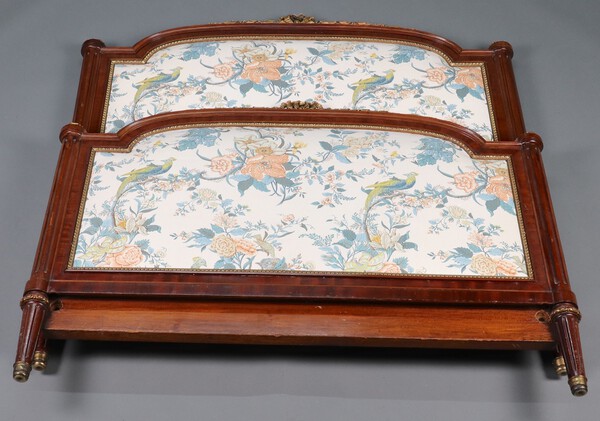 Lot 934 A 19th Century French, carved walnut, panel end bedstead with upholstered panel, raised on turned and fluted supports 139cm h x 140cm w £40-60
