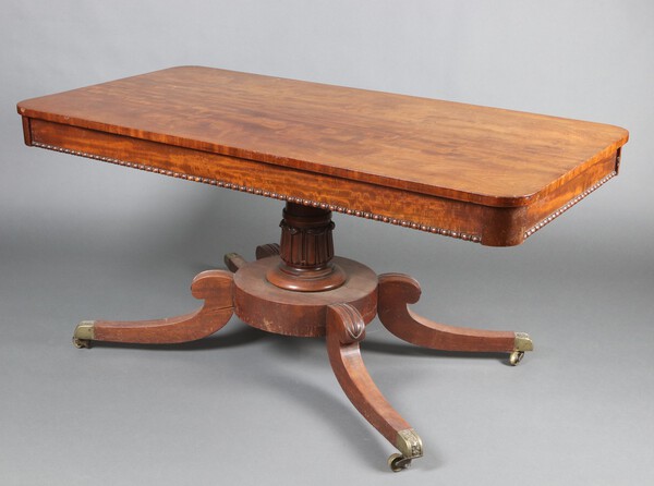 A William IV rectangular mahogany pedestal library table, raised on turned column with splayed feet, brass caps and casters 69cm h x 154cm w x 76cm d