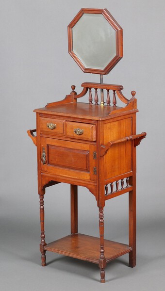 A Victorian walnut wash stand with octagonal bevelled plate mirror and towel rail to each side, the base fitted 2 short drawers above a cupboard enclosed by a panelled door, above a recess, raised on turned supports 157cm h x 49cm w x 34cm d