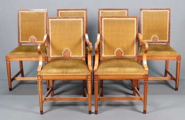 The inlaid decoration is inset with ivory in places, the dining table has light contact marks in places, slight bubbling to the veneer to the top, the chairs have small sections of veneer missing placing, 1 carver has a stain to the upholstery, the blue mirrored glass back to the sideboard is showing signs of deterioration, 2 small sections of veneer missing to the top long drawer and to the right base of the pedestal, all items are sun bleached in places