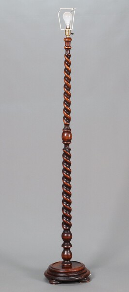 Lot 948 A 1930's spiral turned oak standard lamp raised on a circular base 163cm h x 35cm diam. £40-50