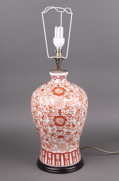 A porcelain table lamp in the form of a red-iron enamelled vase 35cm