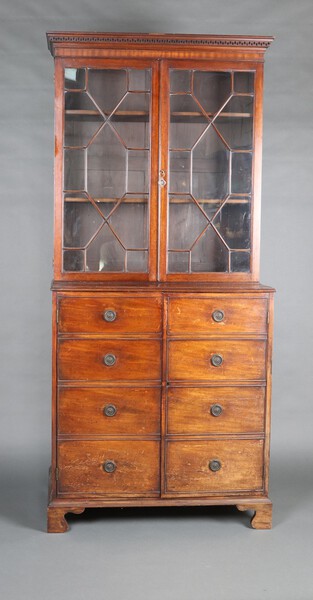 A 19th Century mahogany bookcase on cabinet, the upper section with Grecian key pattern cornice, fitted shelves enclosed by astragal glazed panelled doors, the base fitted a cupboard enclosed by panelled doors in the form of 8 short drawers 210cm h x 194cm w x 48cm d