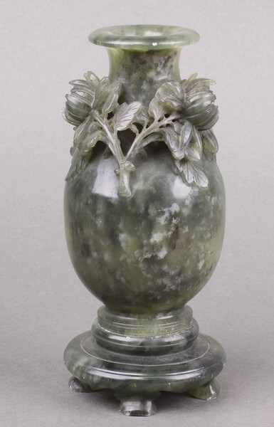 A Chinese spinach jade vase with floral decoration on a circular base 19cm