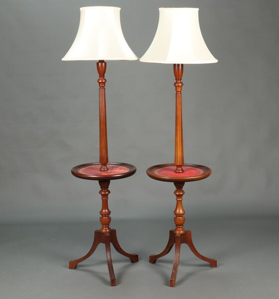 Lot 962 A pair of turned and reeded beech standard lamps, each incorporating a wine table with red inset surfaces, raised on a pillar and tripod bases 134cm h x 40cm diam. £40-60